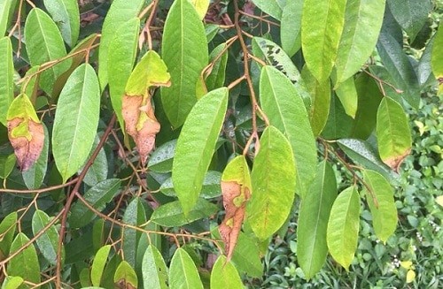 - Triệu chứng: Tác nhân là nấm Rhizoctonia sp. Vết bệnh ban đầu là những đốm màu nâu sũng nước, sau đó lan rộng dọc theo hai mép lá làm cho lá không phát triển được, sau đó khô và rụng, cành non cũng khô dần và chết cả cây