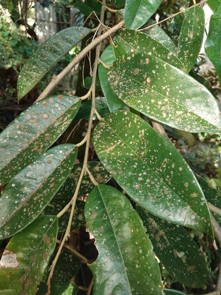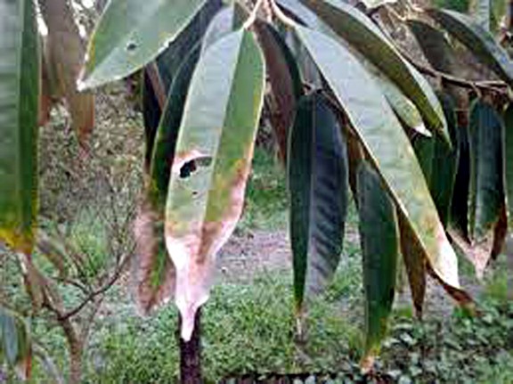 - Triệu chứng: Tác nhân là nấm Collectotrichum Zibethinum gây ra. Thường xuất hiện trên những lá già, vết bệnh bắt đầu từ mép lá hay chóp lá lan dần vào trong phần phiến lá, để lại các đường viền hình tròn có màu nâu đậm dọc hai gân chính