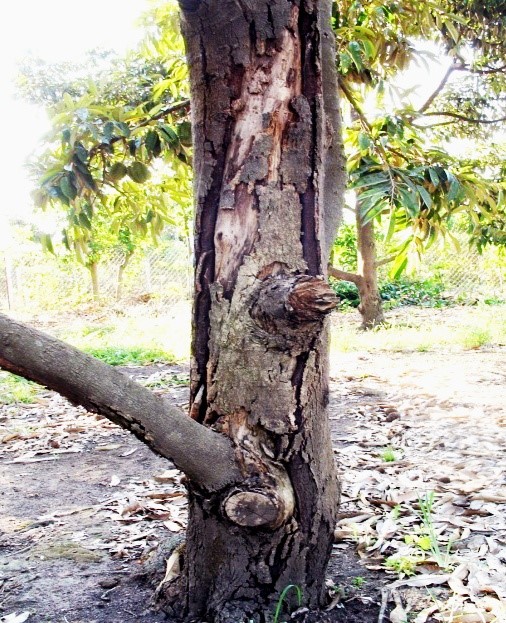 - Triệu chứng: Tác nhân gây hại là nấm Phytophthora Palmivora, lưu tồn chủ yếu trong đất, trong nước và trong các bộ phận bị bệnh của cây sầu riêng. Nấm tấn công phần rễ non gần mặt đất và lan dần tới phần vỏ của gốc sát mặt đất, sau đó di chuyển lên phần vỏ thân. Lúc này vỏ cây chuyển sang màu nâu, bị thối và chảy nhựa. Thường xảy ra trong mùa mưa, đôi khi các cành trên cao, lá và trái cũng bị tấn công, làm thối trái hàng loạt