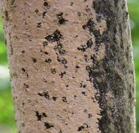 - Triệu chứng: Tác nhân là nấm corticium salmonicolor. Nấm thường tạo một lớp tơ, nấm lúc đầu có màu vàng trắng đục sau đó chuyển sang màu hồng nhạt phát triển xung quanh vỏ cành cây, hút dinh dưỡng làm vỏ cành chỗ bị hại khô và rụng lá cả cành, cuối cùng làm cành chết khô