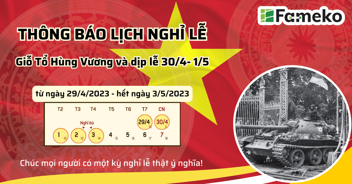 CÔNG TY CỔ PHẦN FAMEKO AGRITECH thông báo lịch nghỉ lễ Giỗ Tổ Hùng Vương, Ngày Giải phóng Miền Nam (30/04/1975 - 30/04/2023) và Quốc tế Lao động 01/05